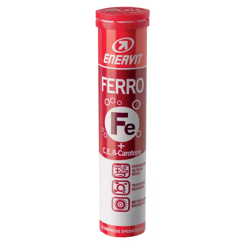 Descrizione Enervit Ferro è un integratore in compresse di ferro, vitamina C, E e beta-carotene. La vitamina C contribuisce al normale metabolismo energetico e il ferro contribuisce al normale trasporto di ossigeno nell’organismo. Formato in compresse effervescenti da sciogliere in acqua e apporta il 100% dell'assunzione giornaliera raccomandata di ferro. Contribuisce al mantenimento della normale funzione del sistema immunitario, alla normale formazione del collagene per la normale funzione delle cartilagini e alla riduzione della stanchezza e dell’affaticamento. La vitamina C contribuisce alla riduzione della stanchezza e dell'affaticamento.