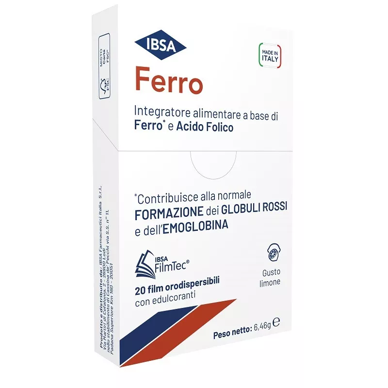 Modalità d'uso Ferro IBSA è disponibile sotto forma di film orodispersibili, una forma di assunzione dell’integratore molto semplice e pratica. Non deve essere assunto con acqua, si scioglie in pochi secondi una volta appoggiato sulla lingua. Può essere assunto in ogni momento e in ogni condizione, anche da parte di persone con difficoltà di deglutizione, allettate o in condizioni di particolare fragilità.
