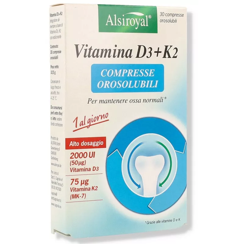 Descrizione Integratore alimentare in compresse orosolubili a base di vitamina D3 e K2 utile per mantenere ossa forti.