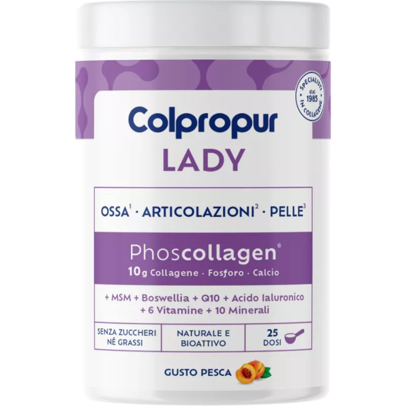 L'azione sull'apparato muscolo-scheletrico di Colpropur LADY si basa principalmente sulle proprietà di un ingrediente esclusivo: il Phoscollagen®, composto da peptidi bioattivi di collagene idrolizzato Colpropur D® e fosfato di calcio, dosati nella corretta proporzione necessaria per mantenere ossa sane. La formula specifica di Colpropur LADY aiuta a: - stimolare e supportare la produzione di collagene per ossa, cartilagini e pelle; - mantenere ossa normali, sane e forti; - migliorare le condizioni della pelle, rallentare i segni dell’invecchiamento cutaneo, attenuare rughe e inestetismi della pelle; - rinforzare pelle, unghie, capelli e denti.