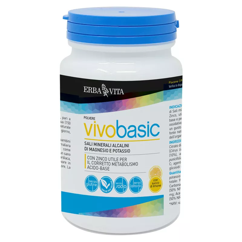 Descrizione VIVOBASIC è un integratore alimentare a base di sali minerali alcalini di magnesio e potassio, arricchito con zinco, utile per mantenere un corretto metabolismo acido-base e per contribuire alla protezione delle cellule dallo stress ossidativo. Completano la formula il succo di limone, che dona un gusto gradevole alla preparazione e l’estratto di acerola fonte naturale di vitamina C, che favorisce le naturali difese dell’organismo e svolge un’azione di sostegno e ricostituente.