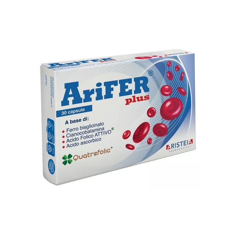 Descrizione Arifer Plus capsule è un integratore alimentare a base di vitamine e minerali. Il ferro contribuisce alla normale formazione dei globuli rossi e dell'emoglobina. La vitamina B12 contribuisce alla normale formazione dei globuli rossi. L'acido folico contribuisce alla crescita dei tessuti materni in gravidanza, alla normale sintesi degli aminoacidi ed alla normale emopoiesi. La vitamina C accresce l'assorbimento del ferro. Ferro, vitamina B12, vitamina C e acido folico, contribuiscono alla riduzione della stanchezza e dell'affaticamento. Arifer Plus capsule è utile in tutti i casi di ridotto apporto dietetico o aumentato fabbisogno di tali nutrienti.