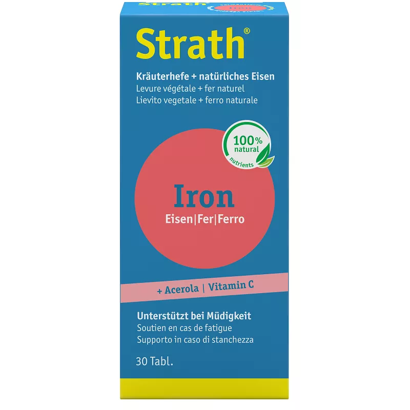 Strath Iron contiene lievito vegetale fermentato e ferro fermentato naturale, ottenuto dal fungo koji. Il ferro contribuisce alla riduzione della stanchezza e dell’esaurimento e a un normale metabolismo energetico. Il ferro naturale è ben tollerato ed è altamente biodisponibile. L’aggiunta di vitamina C da bacca di acerola migliora l‘assorbimento del ferro.