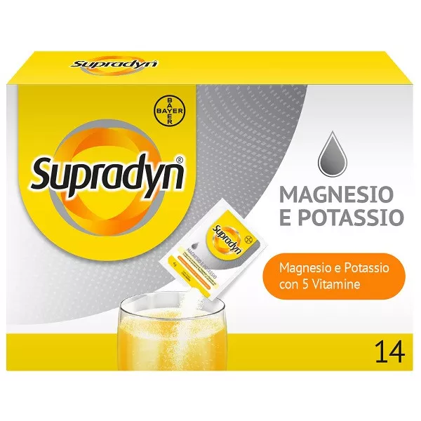 Descrizione Integratore alimentare di magnesio e potassio con vitamine. Supradyn Magnesio e Potassio è particolarmente indicato nei casi di aumentato fabbisogno fisiologico o di ridotto apporto con la normale dieta. La sua formula contribuisce a ridurre stanchezza e affaticamento e a mantenere, grazie alla presenza del magnesio, l’equilibrio elettrolitico/idrosalino. Supradyn Magnesio e Potassio non contiene zucchero e ha un bassissimo contenuto di sale (sodio).