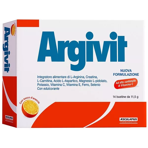 Ingredienti L-arginina, magnesio L-pidolato, acidificante: acido citrico; acido L-aspartico, creatina monoidrato, potassio citrato, L-carnitina tartrato, succo d'arancia, aromi, maltodestrine, acido L-ascorbico (vitamina C), ferro fosfato, DL-alfa-tocoferil acetato (vitamina E), edulcorante: sucralosio; agente antiagglomerante: biossido di silicio; colorante: betacarotene; sodio selenito.