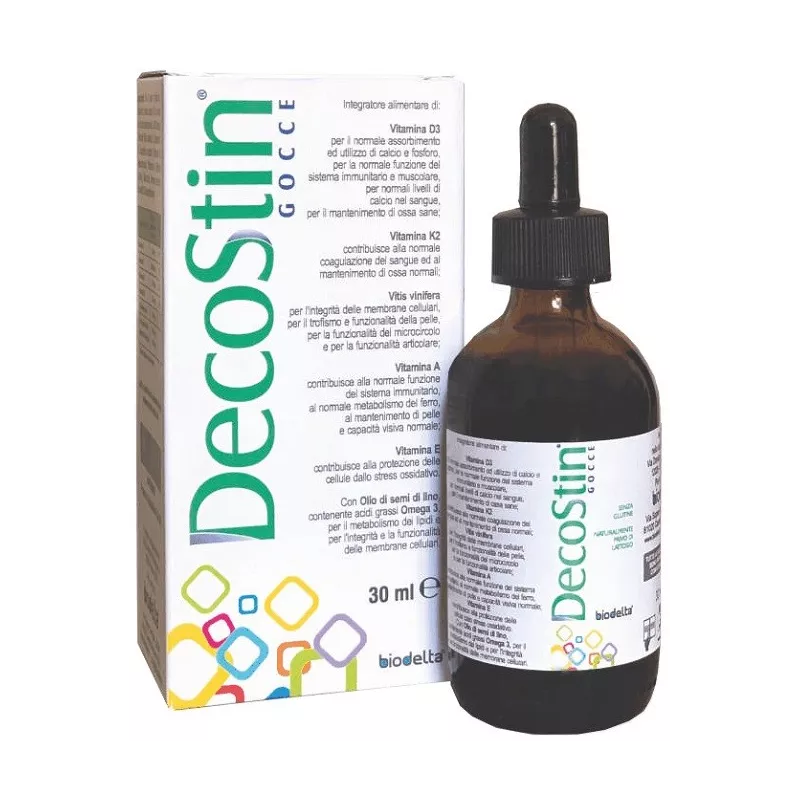 Descrizione Integratore alimentare di vitamina D3, vitamina K2, Vitis vinifera, vitamina A e vitamina E, con olio di semi di lino contenente acidi grassi omega-3.