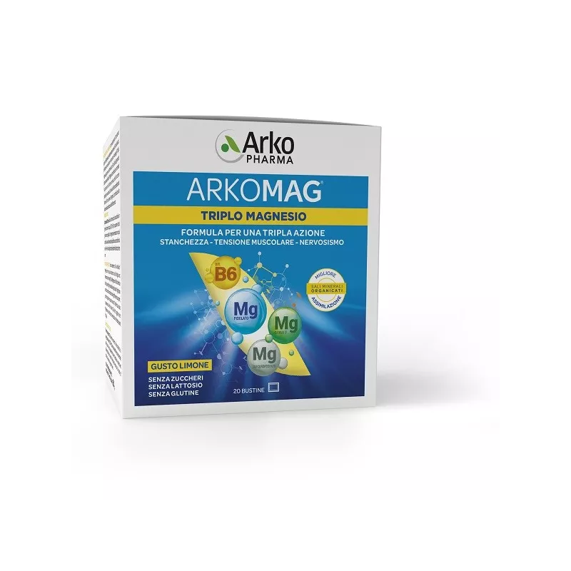 Descrizione Integratore alimentare con edulcoranti. Uso scarso apporto di magnesio potrebbe essere causa di stanchezze, affaticamento muscolare e nervosismo. Arkomag triplo magnesio propone una formula con 3 tipi di sali organicati altamente assimilabili. Il magnesio contribuisce al normale funzionamento del sistema nervoso, della funzione psicologica e muscolare. La formula è inoltre completata da vitamina B6 che, insieme al magnesio, contribuisce alla riduzione della stanchezza e dell'affaticamento.