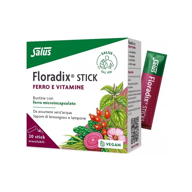 Floradix STICK contiene ferro, vitamine B2, B6, B12, C, niacina e acido folico che contribuiscono alla riduzione della stanchezza e dell’affaticamento.