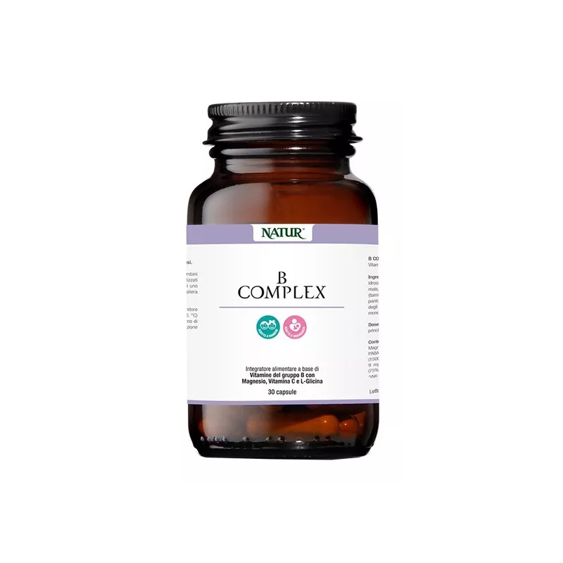 Descrizione Integratore alimentare a base dell'intero complesso di vitamine del gruppo B per il benessere del sistema nervoso e della corretta regolazione ormonale. Il magnesio, la vitamina B1 (tiamina), la vitamina B8 (biotina), la vitamina B6, la vitamina B12 e la vitamina C contribuiscono alla normale funzione psicologica, al metabolismo energetico e al normale funzionamento del sistema nervoso. La tiamina contribuisce inoltre alla normale funzione cardiaca, mentre la vitamina C, la riboflavina, la vitamina B12, il folato e la vitamina B6 contribuiscono alla riduzione della stanchezza e dell'affaticamento e alla protezione delle cellule dallo stress ossidativo. L'acido pantotenico contribuisce alla normale sintesi e al normale metabolismo degli ormoni steroidei, della vitamina D e di alcuni neurotrasmettitori; contribuisce, inoltre, a prestazioni mentali normali. Il folato contribuisce alla normale funzione psicologica, mentre la colina contribuisce al normale metabolismo dell'omocisteina, al normale metabolismo dei lipidi e al mantenimento della normale funzione epatica. Le materie prime usate sono OGM free e non irradiate. Adatto a bambini e in gravidanza.