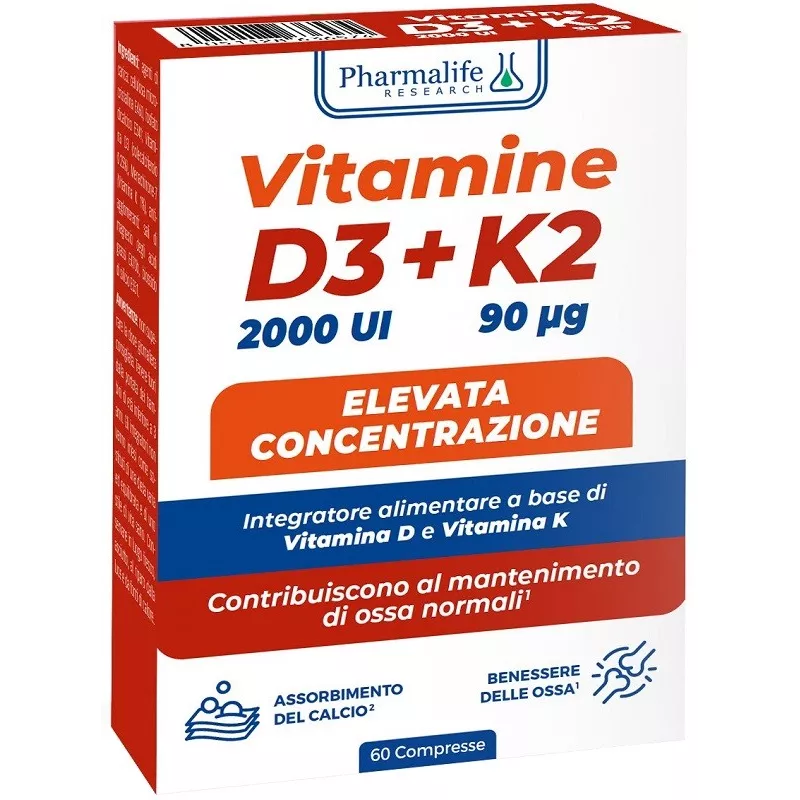 Ingredienti Agenti di carica: cellulosa microcristallina E460, fosfato dicalcico E341; vitamina D3 (colecalciferolo 0,25%), menachinone-7 (vitamina K 1%); anti-agglomeranti: sali di magnesio degli acidi grassi E470b, biossido di silicio E551.