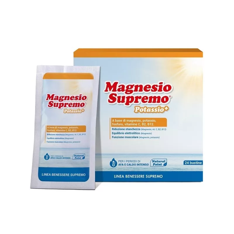 Descrizione Integratore alimentare a base di magnesio che contribuisce alla riduzione di stanchezza e affaticamento. Utile in caso di caldo, afa e attività fisica. Contiene la miscela di Magnesio supremo in associazione a potassio, fosforo e vitamine da fermentazione (C, B2, B12).