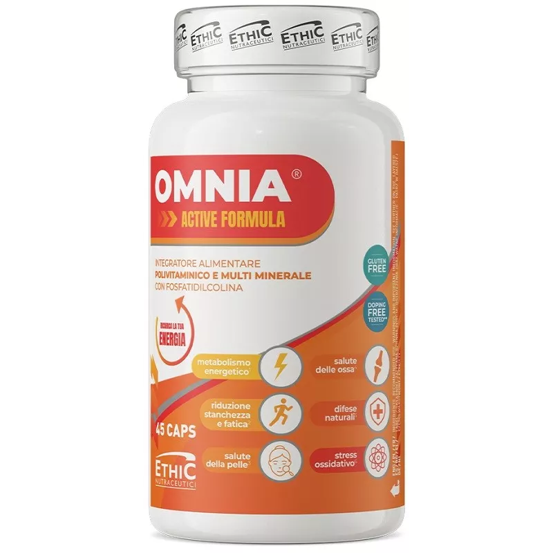 Descrizione Integratore alimentare di vitamine e minerali con fosfatidilcolina. La formulazione apporta il 100% dei valori nutritivi delle vitamine utili all'organismo umano e molti dei minerali coinvolti nei processi metabolici ed enzimatici. In particolare, le vitamine (C, B2, B3, B5, B6, B12) contribuiscono al corretto metabolismo energetico e alla riduzione della stanchezza e dell'affaticamento. Le vitamine B2, B3, B8, A, C insieme a calcio, magnesio e zinco contribuiscono al mantenimento di una pelle normale e di ossa normali. Le vitamine A, B6, B9, B12, C, D, insieme a ferro, rame, selenio e zinco contribuiscono alla normale funzione del sistema immunitario. Infine, contribuisce alla protezione delle cellule dallo stress ossidativo per la presenza delle vitamine B2, C, E, insieme a rame, selenio e zinco. Vitamine e minerali contenuti nel prodotto contribuiscono alla riduzione di stanchezza e affaticamento, alla protezione dallo stress ossidativo, aiutano a mantenere una buona salute della pelle e delle ossa e assistono una normale funzione delle difese naturali dell'organismo. Utile complemento per le persone che necessitano di un apporto di vitamine e minerali.