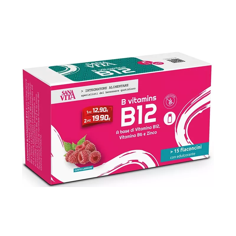 Integratore alimentare a base di vitamina B12, B6 e zinco. Il prodotto è particolarmente utile in caso di stanchezza e affaticamento. E’ particolarmente indicato per soggetti over50 o per chi non consuma sufficiente quantitativo di carne e pesce. Le vitamine B12 e B6 contribuiscono a ridurre stanchezza ed affaticamento ed al normale metabolismo energetico. In particolare le vitamine B6 e B12 e lo zinco favoriscono anche la normale funzione del sistema immunitario. Il prodotto ha un buonissimo gusto Lamponi ed è in un pratico formato flaconcini comodi da portare con sè durante la giornata.