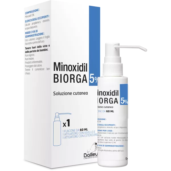 Minoxidil Biorga 5%, soluzione cutanea è un medicinale in forma liquida, da applicare direttamente sul cuoio capelluto. Si usa come trattamento per la perdita dei capelli e non come una cura. Il minoxidil è un vasodilatatore periferico, il cui esatto meccanismo di ripristino della crescita dei capelli non è noto.