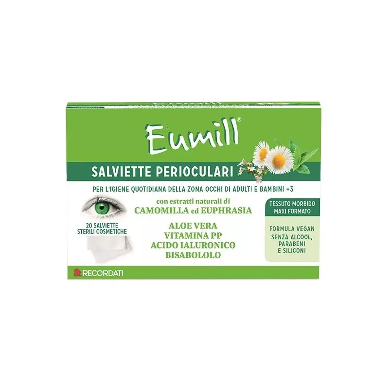 Le Salviette Perioculari Eumill sono indicate per l'igiene quotidiana della zona occhi di adulti e bambini (sopra i 3 anni). Adatte a tutti i tipi di pelle e agli occhi sensibili. Svolgono un'azione detergente, rinfrescante ed emolliente, rispettando la barriera idrolipidica della zona perioculare.