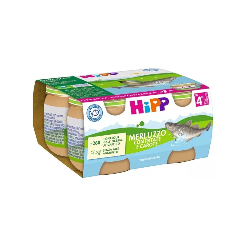 merluzzo 20%, patate* 20%, carote* 7%, farina di riso*, olio di semi di girasole*, succo di limone* da concentrato.
