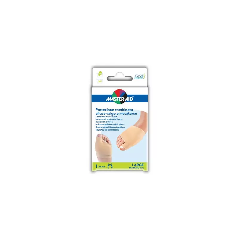 Protezione composta da un tessuto elastico morbido e confortevole associato a un cuscinetto in gel che offre una protezione estesa alle aree metatarsali e all'alluce valgo.