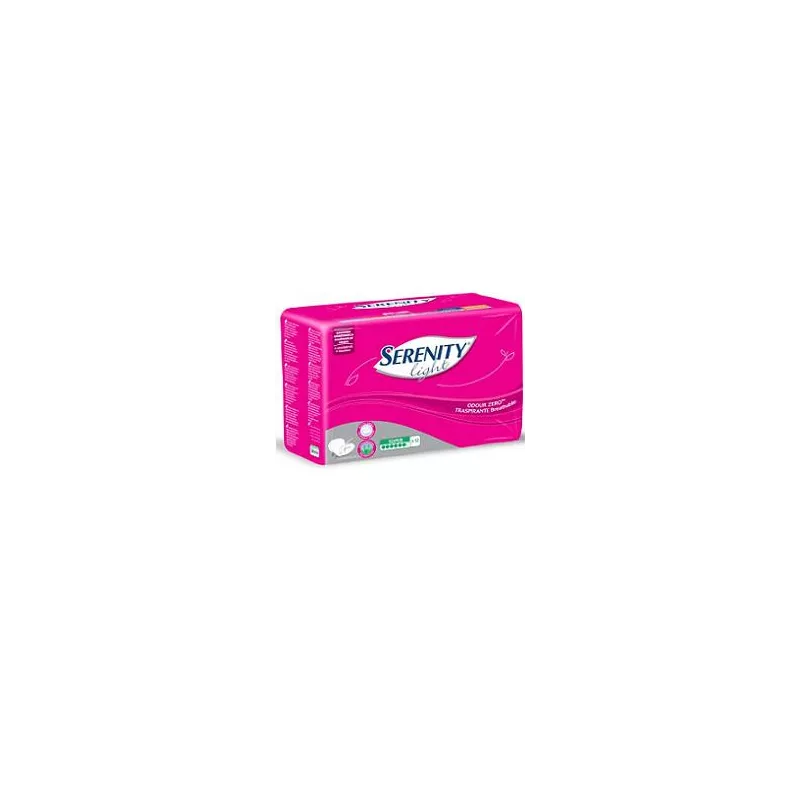 Dispositivo medico CE. Serenity Light si fissa alla normale biancheria intima, grazie alla striscia adesiva longitudinale. Il tampone assorbente sottile e compatto, permette di assorbire rapidamente e trattenere il liquido all’interno dell’assorbente, lontano dalla pelle, lasciando una sensazione di asciutto. La sua sagoma anatomica protegge dove serve, senza segnare. Le particolari fettucce elasticizzate curve, aderiscono in maniera ottimale al corpo e offrono grande comodità. L’Aloe presente sul tessuto non tessuto a contatto con la pelle offre una piacevole sensazione di delicatezza, mentre il rivestimento esterno in tessuto non tessuto traspirante favorisce la traspirabilità cutanea. In più Serenity Light è dotato del sistema Odour Zero che ostacola la formazione dei cattivi odori.