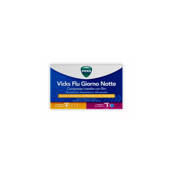 Vicks Flu Giorno Notte è indicato per il trattamento sintomatico a breve termine della congestione nasale e sinusale associata a sintomi di raffreddore e influenza come dolore, mal di testa e/o febbre e solo in combinazione con sintomi di dolore notturno che causano difficoltà ad addormentarsi.