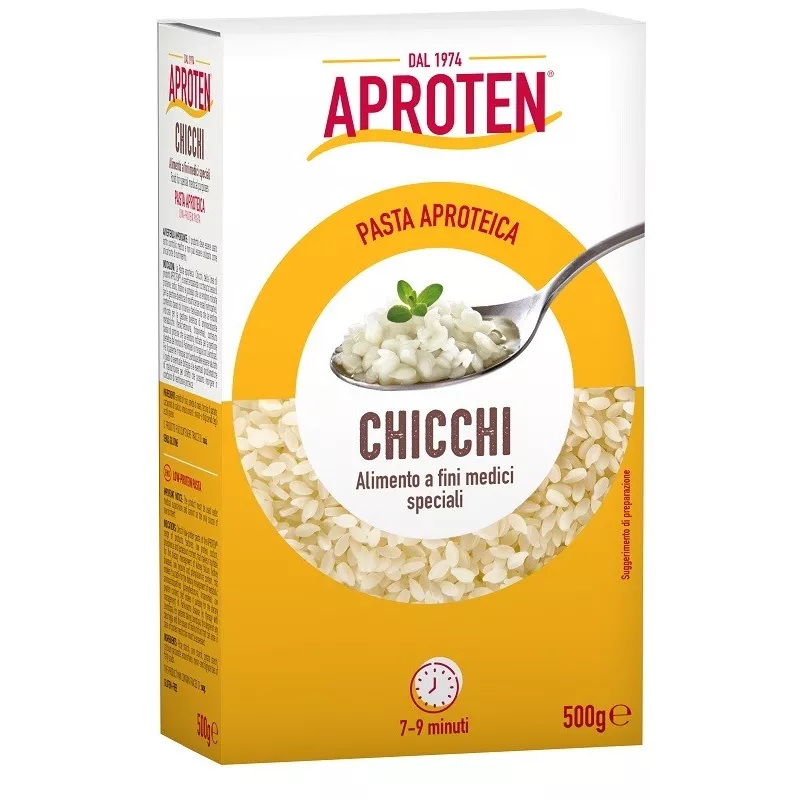 Descrizione La Pasta aproteica della linea di prodotti APROTEN, è caratterizzata da: contenuto basso di proteine, sodio, fosforo e potassio che la rendono indicata per la gestione dietetica di insufficienze renali (nefropatie); contenuto basso di tirosina e fenilalanina che la rendono indicata per la gestione dietetica di aminoacidopatie metaboliche (fenilchetonuria, tirosinemia); contenuto basso di proteine che la rendono indicata per la gestione dietetica del morbo di Parkinson (in terapia con Levodopa). Per il paziente in terapia con Levodopa deve essere valutato il grado di eventuale disfagia e le eventuali problematiche di malnutrizione per difetto che possono insorgere in condizioni di restrizione proteica