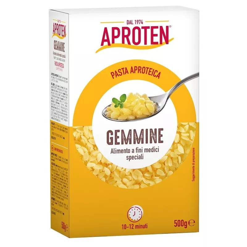 Descrizione La Pasta aproteica della linea di prodotti APROTEN, è caratterizzata da: contenuto basso di proteine, sodio, fosforo e potassio che la rendono indicata per la gestione dietetica di insufficienze renali (nefropatie); contenuto basso di tirosina e fenilalanina che la rendono indicata per la gestione dietetica di aminoacidopatie metaboliche (fenilchetonuria, tirosinemia); contenuto basso di proteine che la rendono indicata per la gestione dietetica del morbo di Parkinson (in terapia con Levodopa). Per il paziente in terapia con Levodopa deve essere valutato il grado di eventuale disfagia e le eventuali problematiche di malnutrizione per difetto che possono insorgere in condizioni di restrizione proteica.