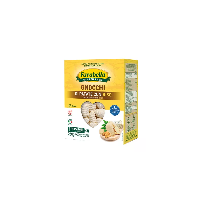 Descrizione Gnocchi di patate con riso senza glutine specificamente formulati per persone intolleranti al glutine. Adatto a vegani. Senza OGM e uova. Con acqua di Sorgente della Majella.