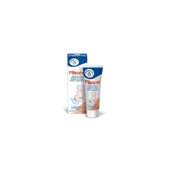 Pasta al 50% ossido di zinco, prodotto ad azione lenitiva e rigenerante. La formulazione a base di ossido di zinco al 50% e di sostanze emollienti lenitive fanno di Milsana una pasta barriera protettiva, ideale nel trattamento degli stati irritati causati da agenti esterni. Previene e migliora le difese cutanee potenziando i processi riparativi della cute. Ipoallergenica. Senza coloranti. Prodotto clinicamente e dermatologicamente testato.
