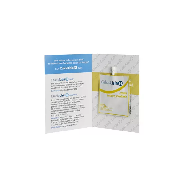 CalcioLisin H è una crema indicata per il trattamento delle infezioni cutanee causate da herpes, come herpes labiale, herpes genitale e fuoco di Sant'Antonio. Si applica direttamente sulla parte interessata; può essere utilizzata da sola o in aggiunta a CalcioLisin H compresse, integratore naturale.