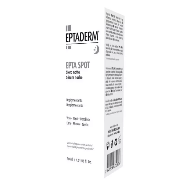 EPTA SPOT Siero notte è un trattamento cosmetico indicato per le iperpigmentazioni cutanee che favorisce l'attenuazione delle macchie esistenti e previene la formazione di nuove macchie. La sua formula completa e innovativa ha un effetto schiarente e dona elasticità, luminosità e un colorito uniforme. Dermatologicamente testato.