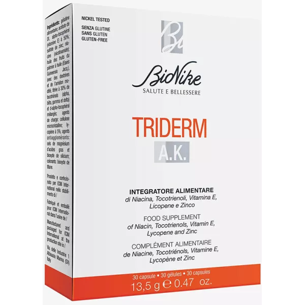 Descrizione Integratore alimentare di niacina (nicotinamide), zinco e vitamina E, con licopene e tocotrienoli da olio di palma. La niacina contribuisce al mantenimento di una pelle normale. Lo zinco contribuisce alla normale sintesi del DNA. La vitamina E contribuisce alla protezione delle cellule dallo stress ossidativo. Nickel tested