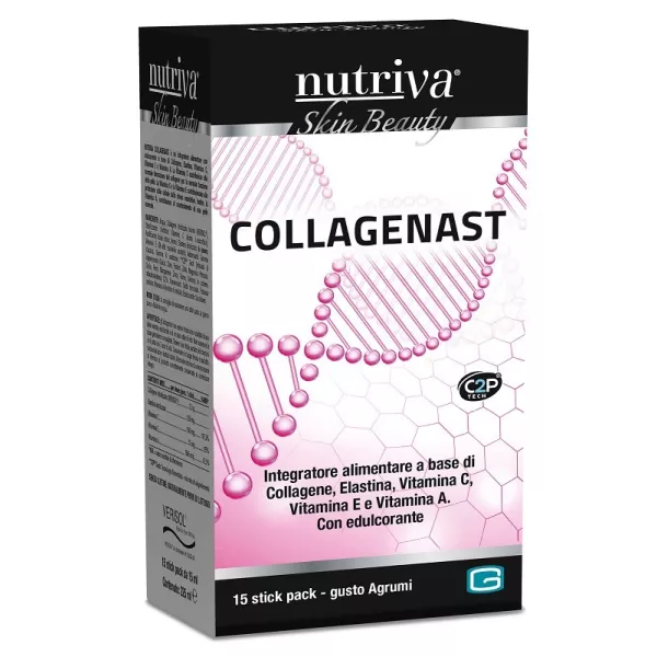 Integratore alimentare con edulcorante a base di collagene idrolizzato, elastina idrolizzata, vitamina C, vitamina A e vitamine E. La vitamina C contribuisce alla normale formazione del collagene per la normale funzione della pelle. La vitamina C e la vitamina E contribuiscono alla protezione delle cellule dallo stress ossidativo. Inoltre, la vitamina A, contribuisce al mantenimento di una pelle normale.
