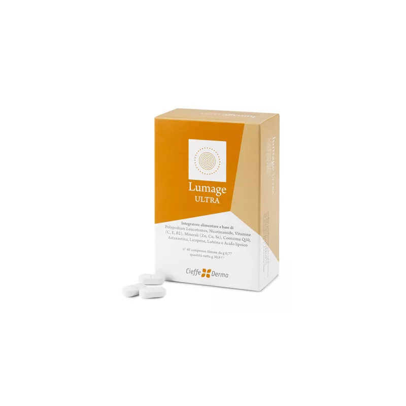Ingredienti Polypodium (Polypodium leucotomos L., maltodestrine) foglie e.s. tit. 1-4; agente di carica: fosfato dicalcico; acido p-aminobenzoico (PABA), niacina (nicotinamide), luteina (Tagetes erecta L. fiore, maltodestrine) tit. 5%, gluconato di zinco, licopene (licopene, maltodestrine, gelatina vegetale, saccarosio, amido di riso) tit. 5%; agenti di rivestimento: polivinilalcol, calcio carbonato, polietileglicole, talco, E172; vitamina C (acido L-ascorbico), coenzima Q10, L-taurina, astaxantina (astaxantina, lecitina da girasole, biossido di silicio, ascorbil palmitato, DL-alfa-tocoferolo) tit. 5%, L-lisina monocloridrato; stabilizzante: polivinilpirrolidone; vitamina E (DL-alfa-tocoferil acetato); agenti antiagglomeranti: sali di magnesio degli acidi grassi, biossido di silicio; acido alfa-lipoico, gluconato di rame, pepe nero (Piper nigrum L.) frutto e.s. tit. 95% piperina, vitamina B2 (riboflavina), selenito di sodio.