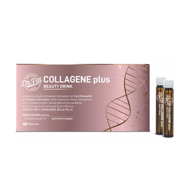 Descrizione Integratore liquido formulato con 5 g di biopeptidi di collagene idrolizzato, acido jaluronico, rame, manganese, per la protezione delle cellule dallo stress ossidativo, e altri principi funzionali quali zinco e biotina, indicati per il benessere della pelle.