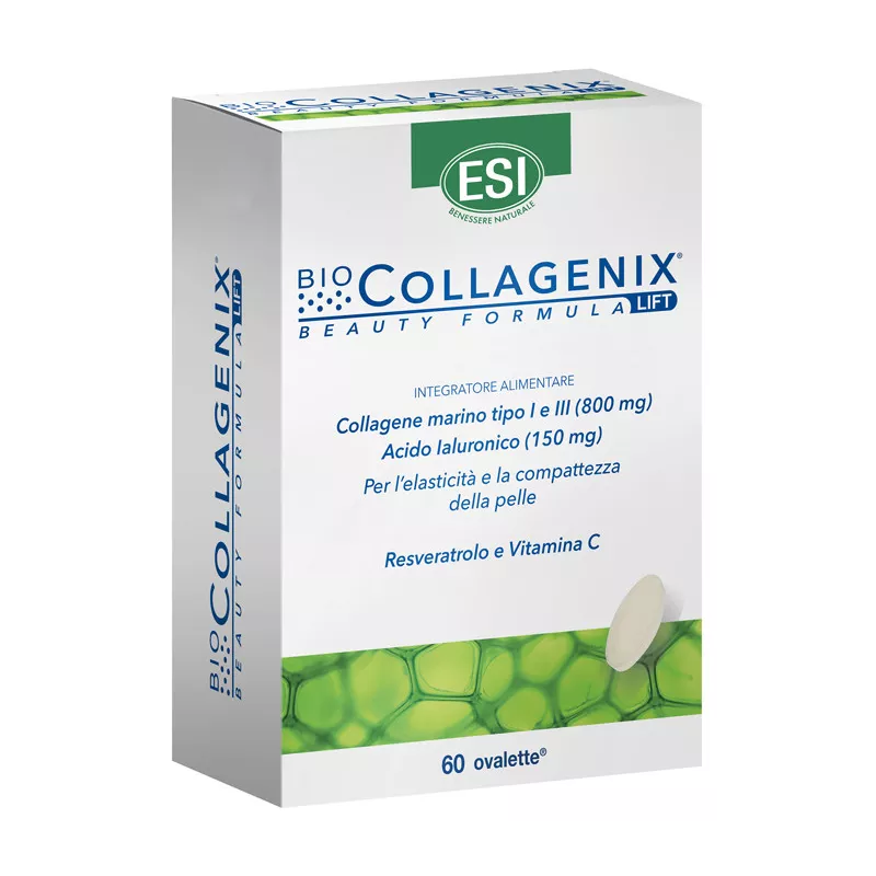 Descrizione Integratore alimentare a base di collagene marino idrolizzato di tipo I e III altamente purificato, acido ialuronico, resveratrolo, vitamina C, rame e zinco. Il collagene, insieme all'acido ialuronico, contribuisce a mantenere l'elasticità e la compattezza della pelle. Biocollagenix è indicato per tutte le persone che vogliono prendersi cura della propria pelle e degli annessi cutanei (capelli e unghie), con un'azione di stimolo proveniente dall'interno dell'organismo. Ideale in caso di eccessiva esposizione al sole, per le persone che lavorano al chiuso e in locali climatizzati che disidratano la pelle e per le persone che non seguono una dieta corretta.