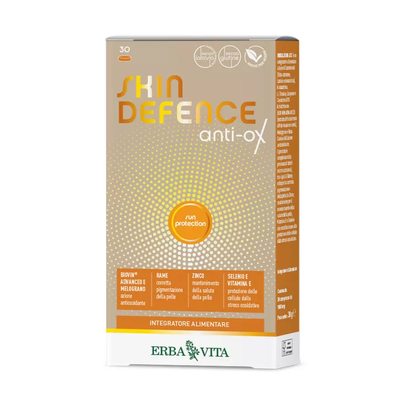 Descrizione Skin Defence anti-ox è un integratore alimentare a base di carotenoidi (beta-carotene, luteina e zeaxantina), astaxantina, L-tirosina, licopene e coenzima Q10. Arricchito con BIOVIN ADVANCED (estratto di vite rossa frutto intero con semi), melograno e rosa canina dall’azione antiossidante. Il prodotto è completato dalla presenza di fattori micronutrizionali, tra i quali il rame, utile per la corretta pigmentazione della pelle, lo zinco, coadiuvante per il mantenimento della salute della pelle, selenio e vitamina E che contribuiscono alla protezione delle cellule dallo stress ossidativo, contrastando l’azione dei radicali liberi.