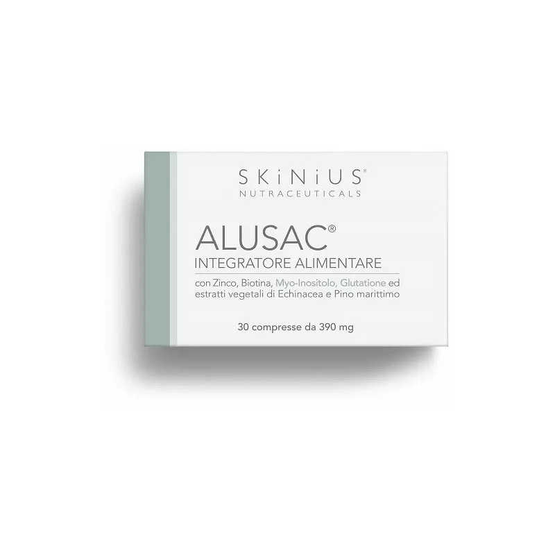 Modalità d'uso Assumere da 1 a 2 compresse al giorno, da deglutire con acqua. Si consiglia l'uso combinato con Alusac Crema, Detergente e Maschera dermocosmetici.