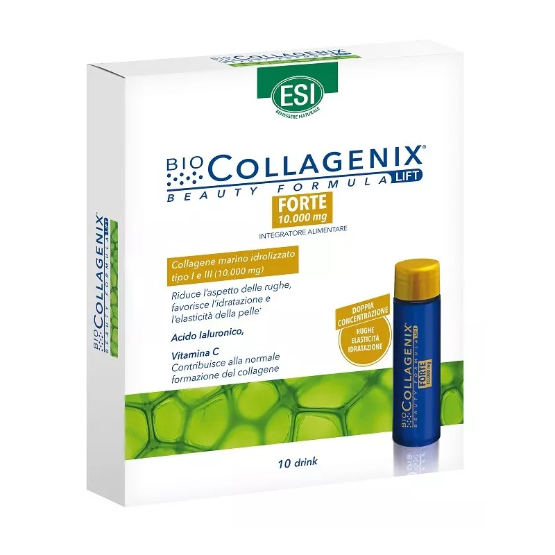 Descrizione Integratore alimentare a base di collagene marino idrolizzato di tipo I e III (10.000 mg per drink), acido ialuronico, succo concentrato di mirtillo, vitamina C, rame e zinco. Cone edulcoranti.