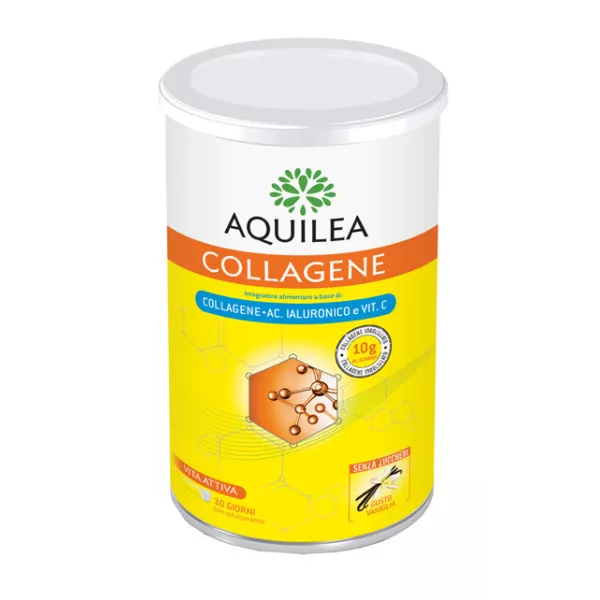 Descrizione Integratore per la funzionalità di articolazioni e cartilagini, contribuisce fisiologicamente al trofismo della pelle. Il collagene è una proteina che si trova naturalmente nelle cartilagini, nelle ossa e nella pelle. Collagene e acido ialuronico sono alla base della struttura della pelle e delle articolazioni, e sono essenziali per il loro fisiologico funzionamento. Aquilea Collagene è un integratore alimentare a base di collagene, acido ialuronico e vitamina C, la quale contribuisce alla normale formazione del collagene, per la fisiologica funzione delle cartilagini, delle ossa e della pelle. Senza zuccheri, gusto vaniglia.