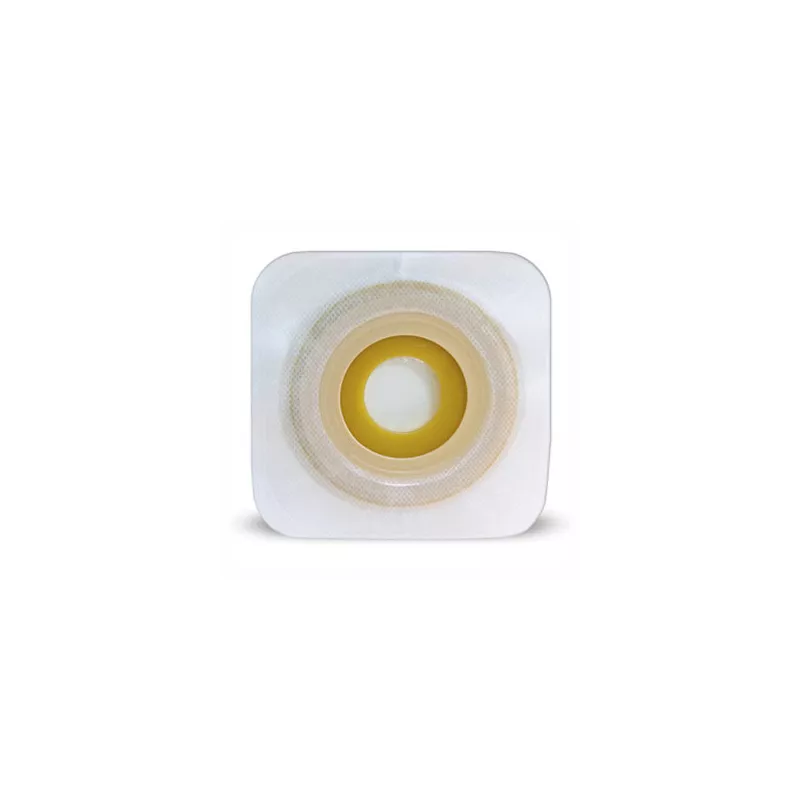 - Lo strato superiore in Tecnologia Durahesive; quando entra in contatto con gli effluenti si gonfia, assorbendo l’umidità e forma un caratteristico collarino (“effetto a collo di tartaruga”) intorno allo stoma, proteggendolo dal contatto con gli effluenti e prolungando il tempo di permanenza in situ del dispositivo.