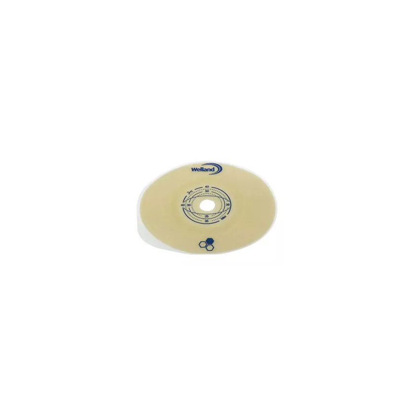 Placca con flangia per urostomia per sistema a due pezzi, dotata di barriera protettiva autoportante con miele di Manuka.