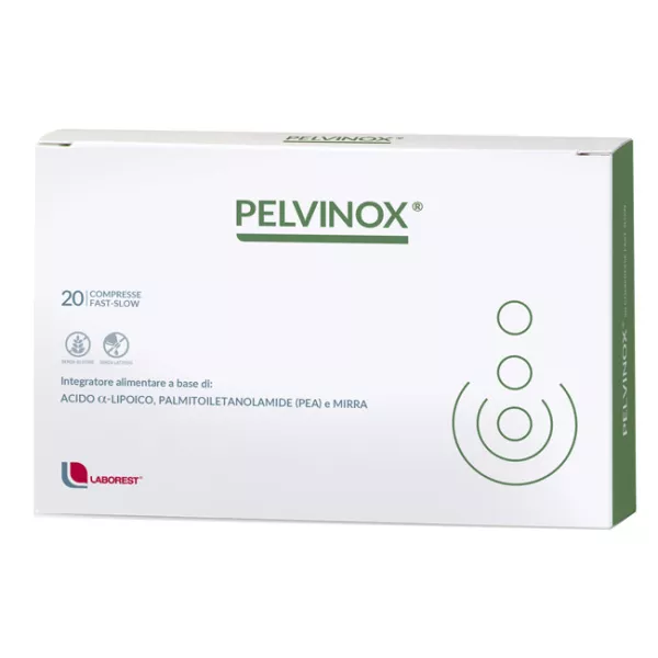 Descrizione Integratore alimentare a base di acido alfa-lipoico, palmitoiletanolamide (PEA) e mirra, utile nei casi in cui sia richiesta una supplementazione di queste sostanze. L'esclusiva tecnica di produzione della compressa di Pelvinox garantisce il rilascio controllato nel tempo dell'acido alfa-lipoico.