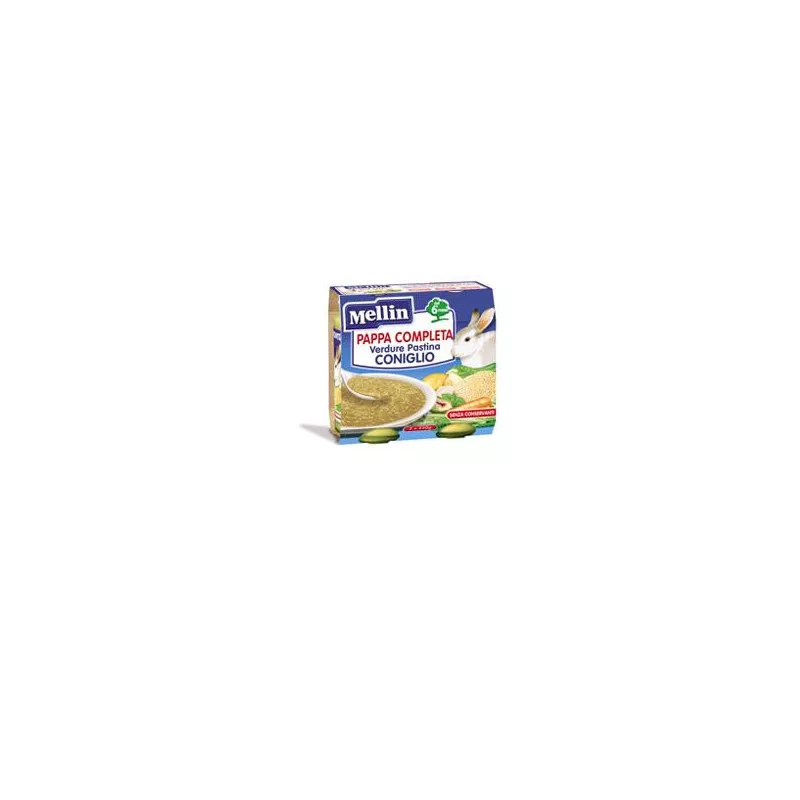 acqua di cottura; verdure (patate, piselli, carote, zucchine; cipolle, sedano; carciofi; spinaci; prezzemolo); carne di coniglio; maltodestrine; pastina di grano duro; amido di mais; olio di semi di girasole; cloruro di sodio.