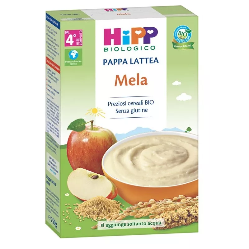latte*, farina di riso* 22%, purea di mela* 16%,