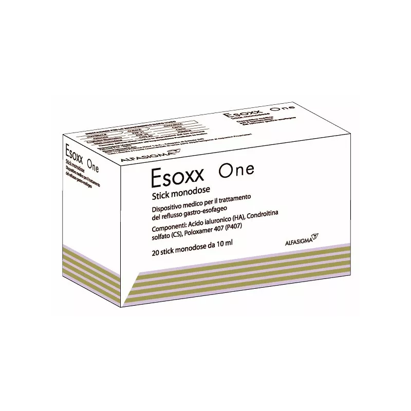 ESOXX ONE è una associazione di acido ialuronico e condroitin-solfato, in grado di esercitare un meccanismo di difesa della mucosa gastro-esofagea originale ed innovativo.