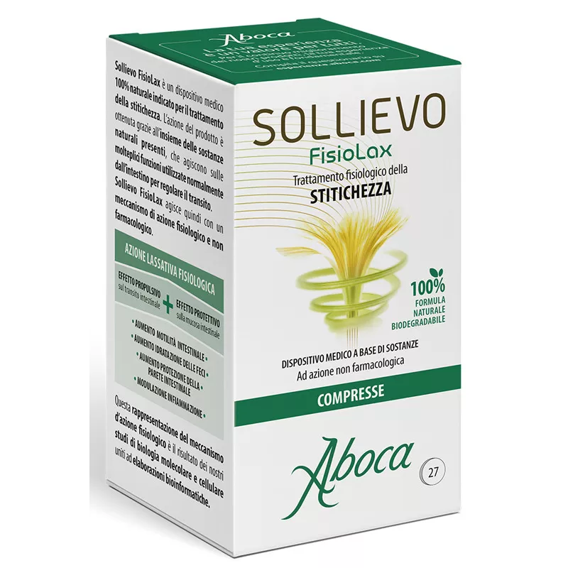 Sollievo FisioLax è un dispositivo medico 100% naturale indicato per il trattamento della stitichezza. L’azione del prodotto è ottenuta grazie all’insieme delle sostanze naturali presenti, che agiscono sulle molteplici funzioni utilizzate normalmente dall’intestino per regolare il transito. Sollievo FisioLax agisce quindi con un meccanismo di azione fisiologico e non farmacologico.