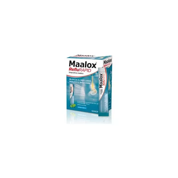 Dispositivo medico ad azione meccanica a base di sodio alginato, bicarbonato di sodio, sodio carbonato e calcio carbonato, formulato per svolgere 3 azioni sinergiche: bloccare il reflusso acido, ridurre il bruciore e proteggere la mucosa dell’esofago. Maalox RefluRAPID dispositivo medico è indicato per il trattamento del reflusso gastro-esofageo al fine di ridurre i sintomi ad esso correlati, come ad esempio: bruciore, pirosi gastrica in gravidanza, esofagite da reflusso, rigurgito acido, cattiva digestione, sintomi notturni da reflusso, tosse e infiammazione laringo-faringea.
