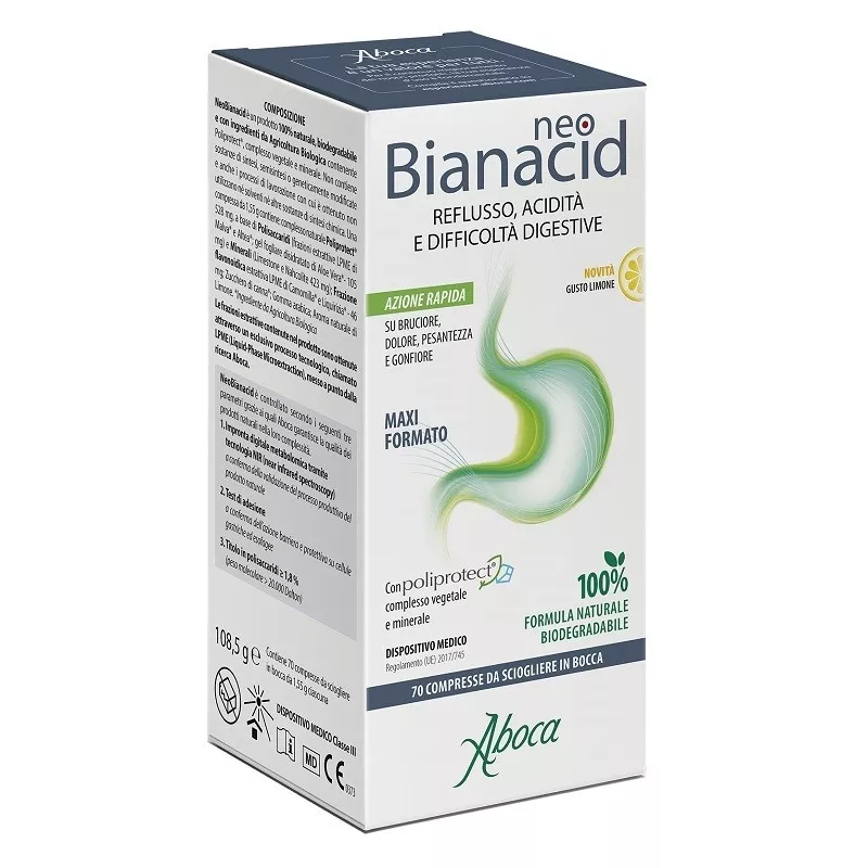 Indicato per il trattamento del reflusso gastroesofageo e del dolore di stomaco (dispepsia dolorosa), caratterizzati da rigurgito acido, bruciore, dolore, tosse irritativa, disfonia. NeoBianacid è indicato anche nel trattamento dei sintomi associati a difficoltà di digestione (dispepsia non dolorosa), quali acidità, pesantezza e gonfiore dopo i pasti, sia ricorrenti che in caso di eccessi alimentari. NeoBianacid può essere utile in prevenzione, nelle situazioni che provocano irritazione della mucosa (ad esempio assunzione di farmaci antinfiammatori o periodi di stress psico-fisico). Il prodotto è adatto anche all’uso in gravidanza, durante l’allattamento e nei bambini sopra i 6 anni.