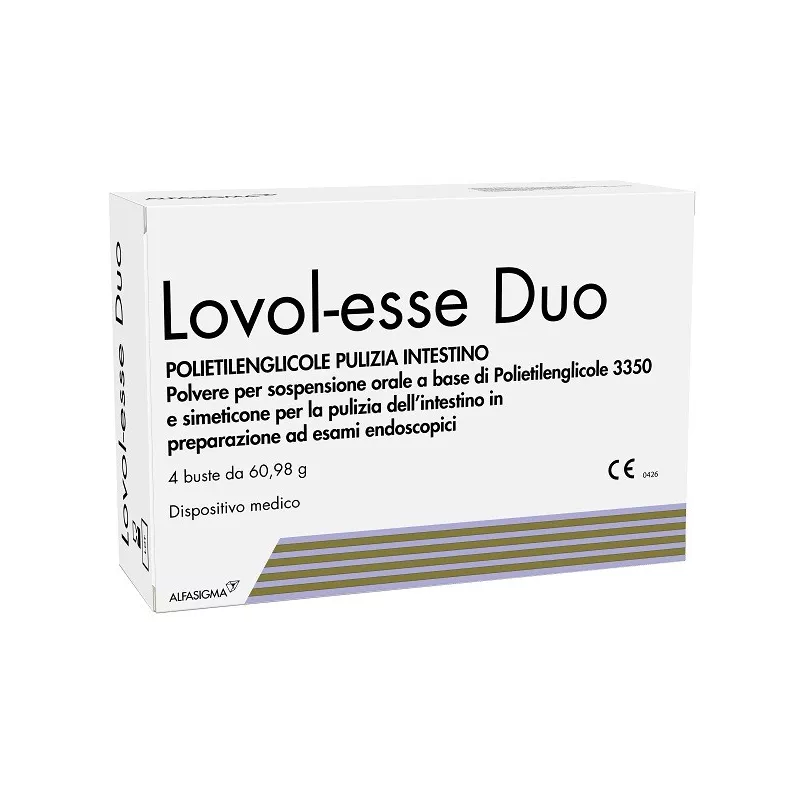 Lovol-esse Duo contiene polietilenglicole 3350, una sostanza inerte che non viene assorbita dall’intestino, non irrita la mucosa, non fermenta e viene escreta invariata dal tratto digestivo. Il Polietilenglicole 3.350 attira una grande quantità di acqua che provoca ammorbidimento della massa fecale stimolando la naturale peristalsi intestinale.