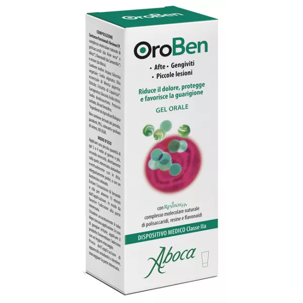 OroBen Gel orale è un prodotto che grazie alla formazione di un film protettivo riduce il dolore e favorisce la guarigione di afte, stomatiti aftose ricorrenti, gengive infiammate e piccole lesioni della bocca dovute ad esempio a trattamenti dentari o all'uso di apparecchi ortodontici e dentiere.