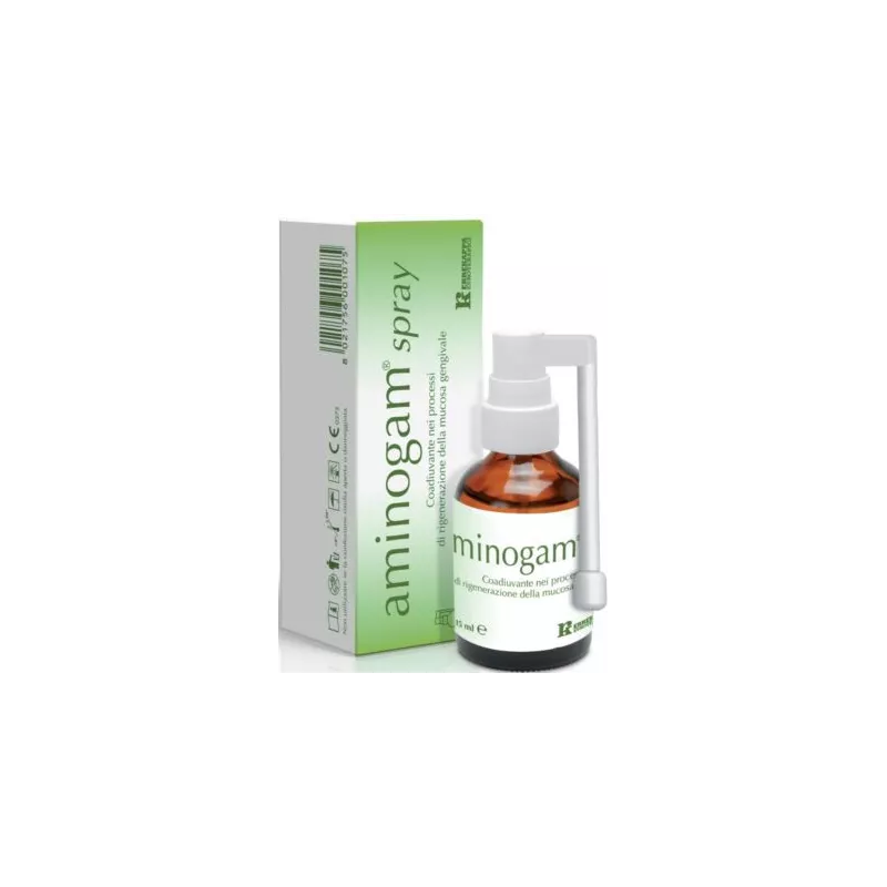 Aminogam spray è un dispositivo medico realizzato in conformità alla Direttiva 93/42/CEE MDD. Il prodotto contiene acido ialuronico, componente principale del tessuto connettivo ed aminoacidi costitutivi del collagene. Aminogam spray coadiuva il processo di rigenerazione tissutale per favorire una veloce guarigione delle aree di lesione e la contemporanea riduzione del dolore. La particolare formulazione spray consente l'agevole applicazione anche nelle aree della bocca più difficilmente raggiungibili.